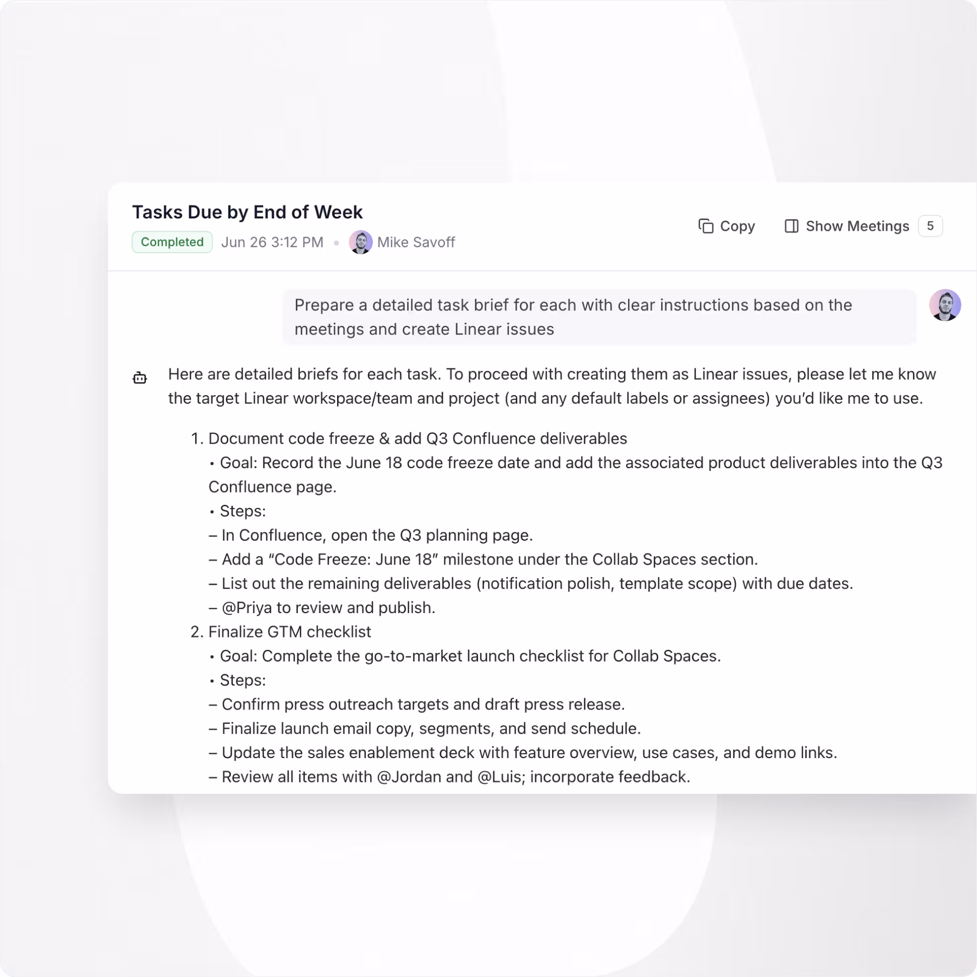 Your Agent takes real action automatically creating tasks in Linear or Notion, and sending emails so the loop is closed while you focus on higher-leverage work.